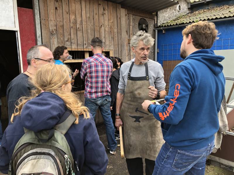 Bij de openbare Werkplaats is het die middag een drukte van belang. Veel bezoekers oriënteerden zich over het cursusaanbod van OWP. Van meubelstoffering, glas-in-lood, smeden tot de kunst van het motoronderhoud.