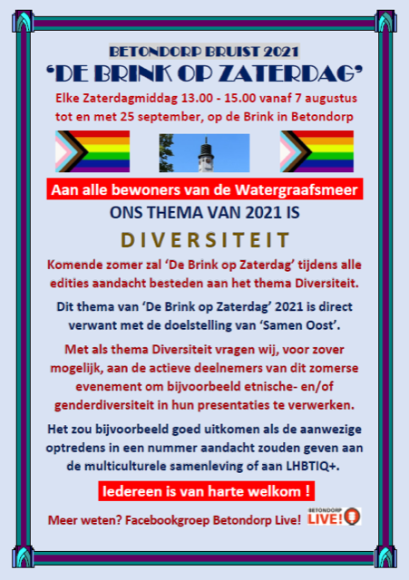 Heb je de route gemist dan kun je deze zomer vanaf 7 augustus tot en met 25 september 2021 elke zaterdagmiddag tussen 13:00 en 15:00 uur terecht op 'De Brink op Zaterdag' voor livemuziek en een non-profit info-markt met Betondorper kunst als onderdeel.